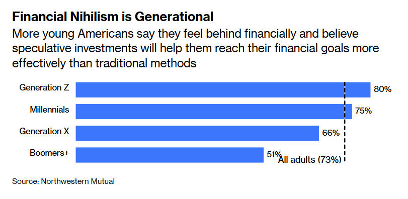 A recent survey from Northwestern Mutual shows that many young people are betting on unconventional high-risk assets because they believe it is the only way to build wealth. It also reveals some good news: Despite a year marked by wild market swings and deep economic uncertainty, more people feel financially secure than they did a year ago, including 39% of Gen Zers (up from 36%) and 52% of millennials (up from 43%). Just a few years ago meme stocks were all the rage, but now it is just straight up gambling, excuse me prediction markets. Some 32% of Gen Zers say they gamble in crypto or sports betting; 35% of millennials own crypto, while 24% bet on sports. Less than 20% of either invest in options or meme stocks. Even more surprising, many of those who don’t feel financially secure believe the only way to reach their goals is to take big risks.