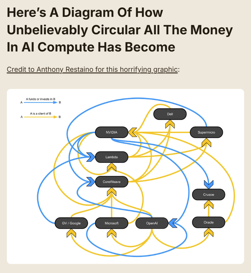 A reader sent me this long (and I mean long) article about the bearish take on AI as an elaboration of my point on the circular nature of AI spending.