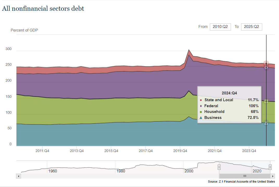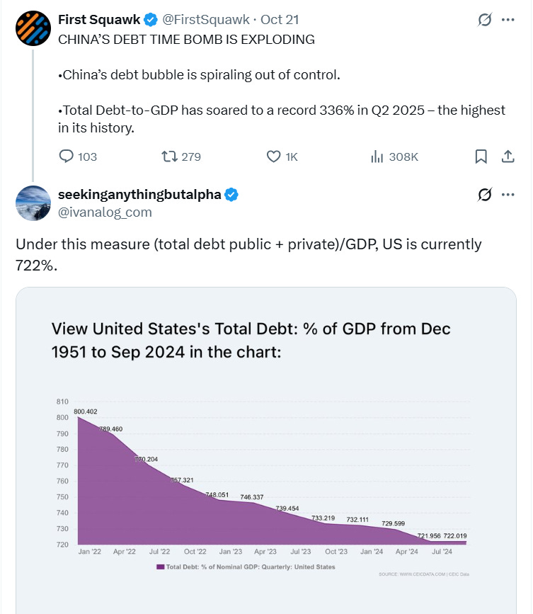 Meanwhile, the China figure is pretty accurate. According to the IMF, the amount of Total Social Financing (the best, equivalent measure to All Nonfinancial Sectors Debt in the US) was 310% of GDP at the end of 2024.
