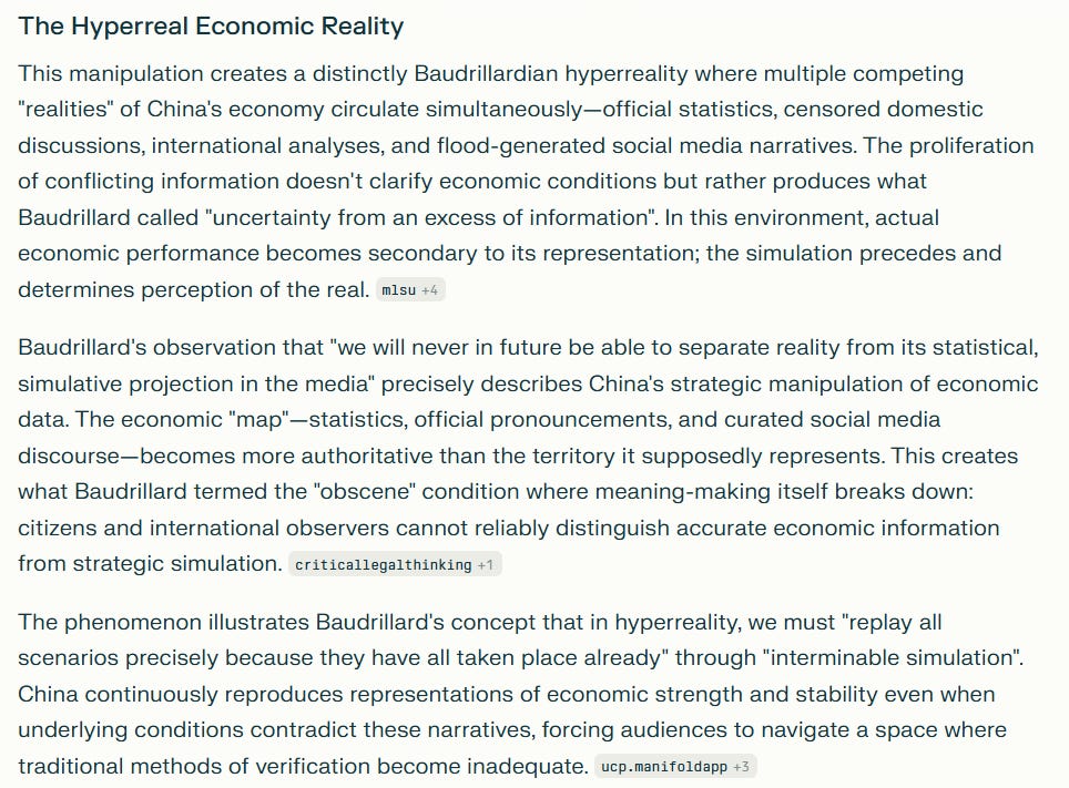 But there is also an aspect of image management in this. Holding the yuan pretty constant versus the USD reinforces the image that China tries to project as the only stable actor in a world thrust into chaos by American perfidy. Resisting currency appreciation serves a real economic purpose for their export-reliant economy, but also serves a propaganda purpose in the hyperreal world of public opinion. And the swarm of Chinese economic misinformation I’m now noticing makes me wonder if, to them, the hyperreal is more important than the real.