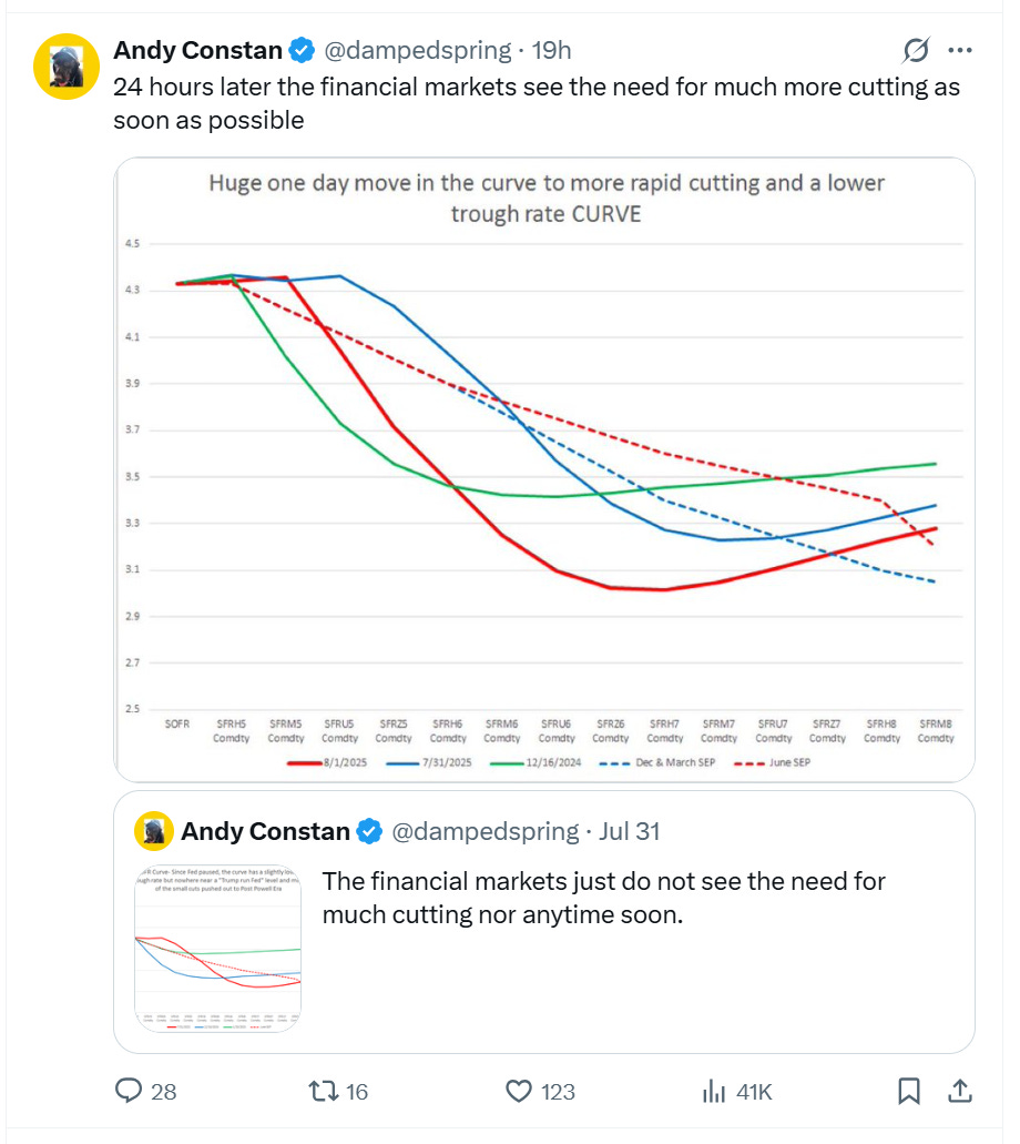 This all being said, I don’t think the shift in pricing actually was overdone. There’s an asymmetry in monetary policy that means that it’s easier to slow the economy with rate hikes than it is to stimulate with rate cuts. And a labor market cooling at this speed tends to be a self-reinforcing process, meaning that were the Fed to need to stop the slowdown, they would need to be easing aggressively already. I’m sympathetic to the Waller view that they should be easing already, but the right thing and the most likely thing are not necessarily the same.