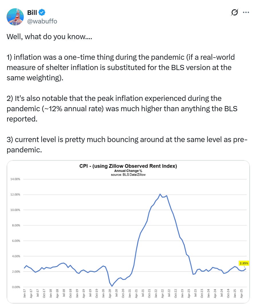 A more coincident version of CPI (using actual rent prices rather than the lagged version that actually goes into it) looks fine.