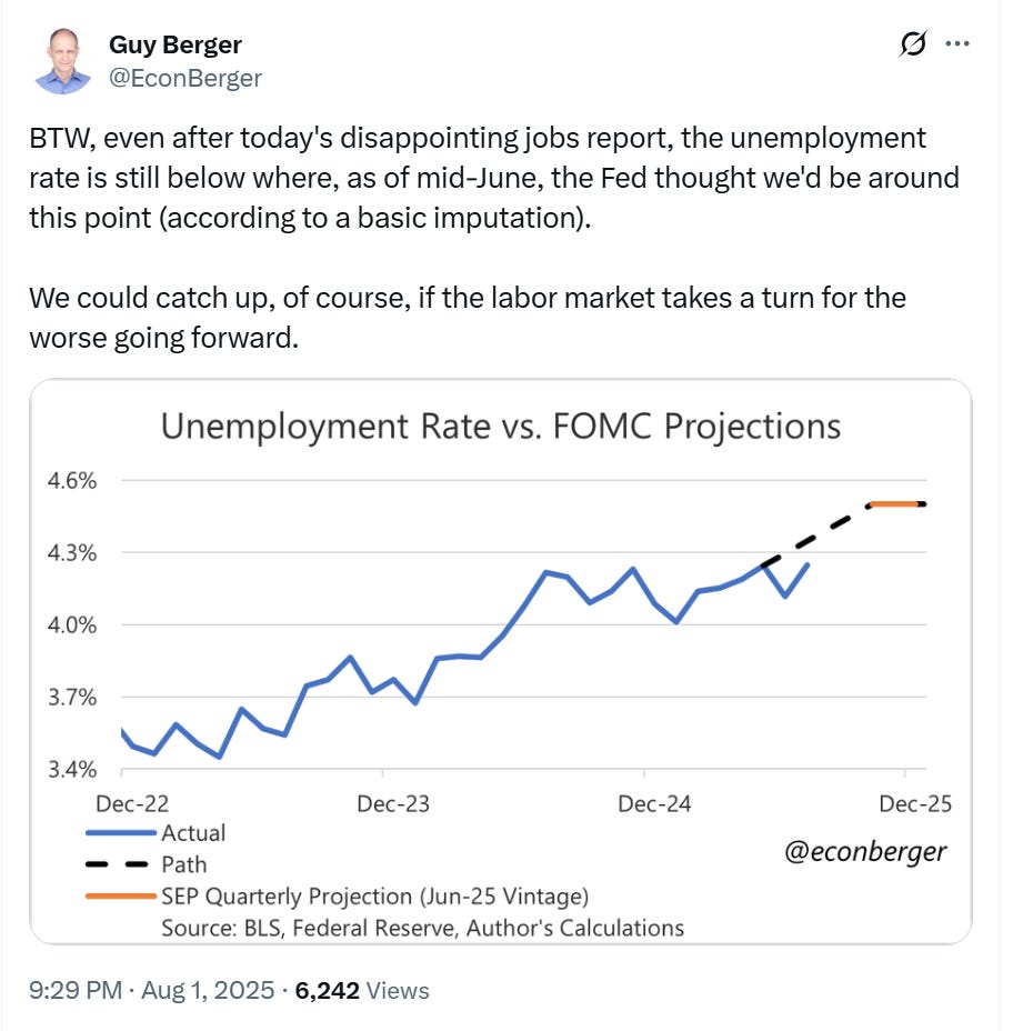 And on the labor market side, the unemployment rate is actually below where the Fed was projecting it to be at this time. When looked at from this perspective, the shift in market pricing after the jobs report on Friday looks overdone.