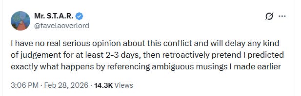 As you may have heard, the US and Israel launched strikes against Iran over the weekend. Generally speaking, about 90% of the information you get about what’s going on in this initial phase is wrong, so the safest course of action is as follows: