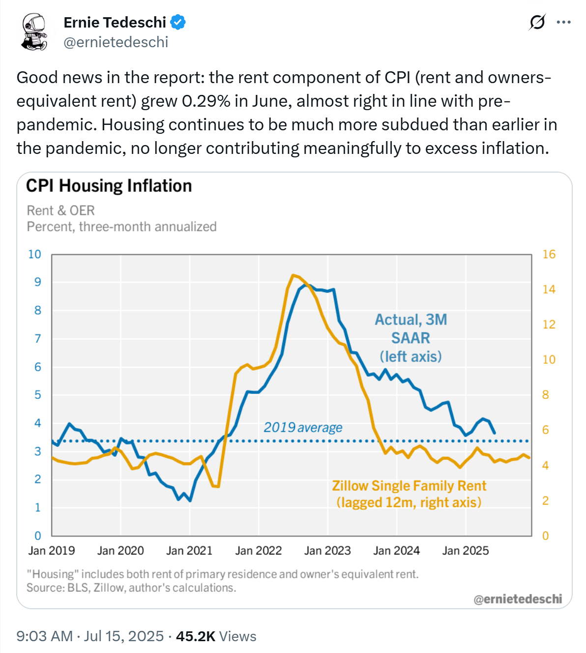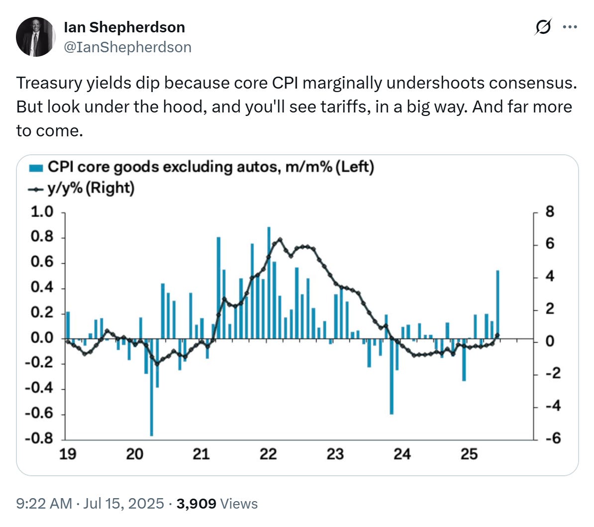 On one hand, monthly core inflation actually came in below expectations, and there certainly wasn’t a tariff-driven surge in inflation, with the level being basically stable around ‘higher than target but not out of control.’